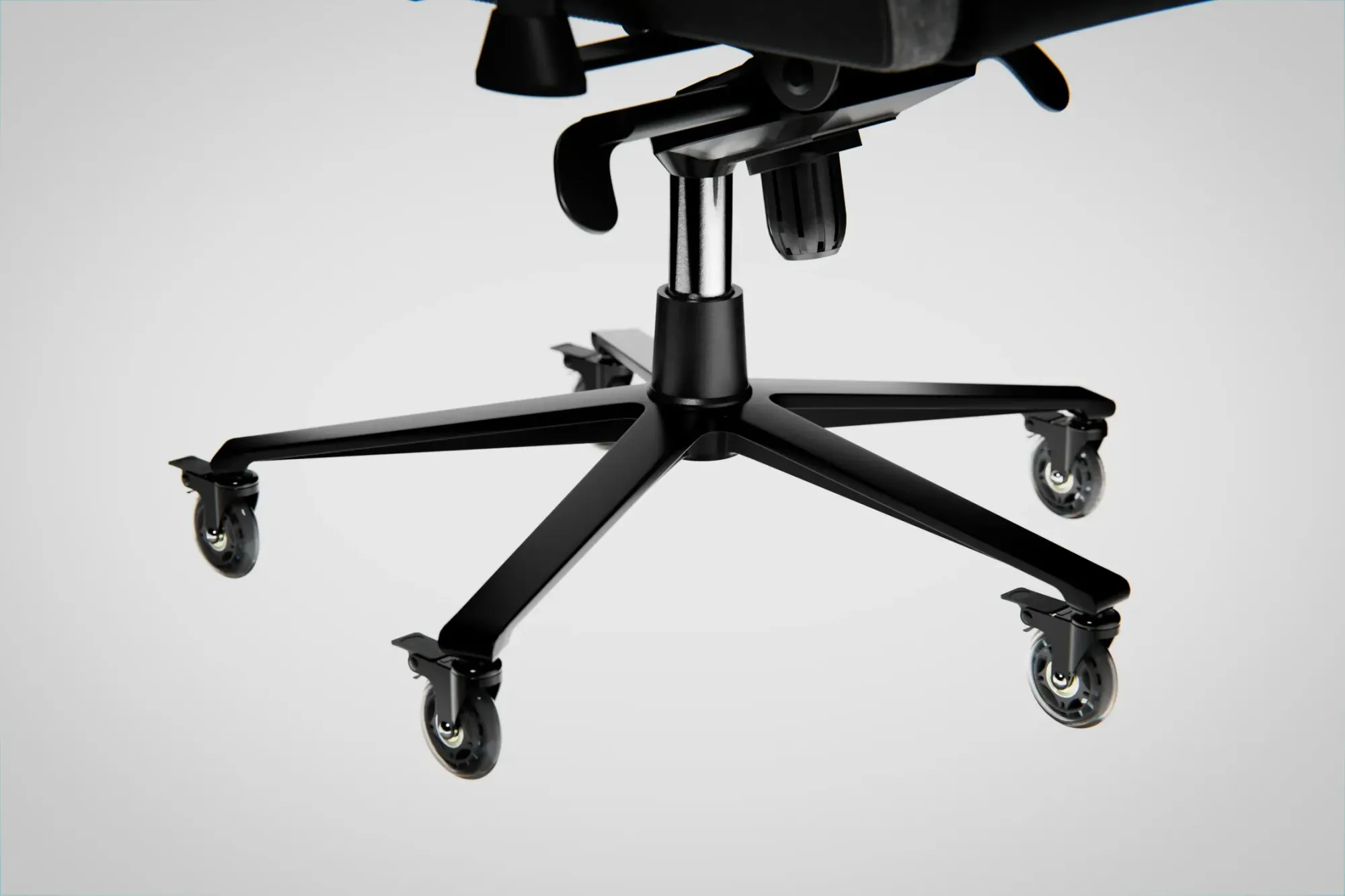 One standout detail is the caster size. Athena X ships with 76 mm PU casters, which are larger than the typical small wheels many chairs use. Bigger wheels usually roll more smoothly on carpet edges and threshold transitions, and PU tends to be friendlier on hard floors. The chair is also not light. Net weight is listed at 24kg (around 50lbs), so it is substantial enough to feel planted. The tradeoff is moving it between rooms is more effort. If you swap to rollerblade style casters later, Blacklyte sells options, but the stock setup is already pretty good.